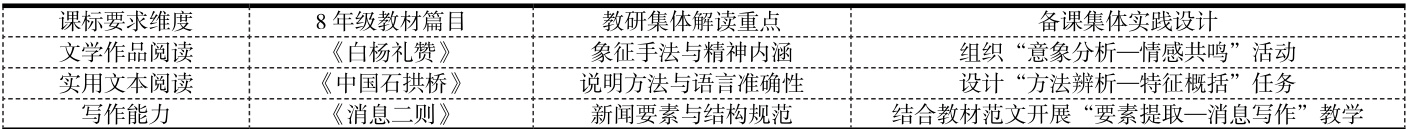 通过教研集体以及备课集体开展的多维度研讨活动,可以助力八年级语文教师精确掌握课程标准要求和教材内容之间的对应关联,教研集体首先对《义务教育语文课程标准》中有关“八年级文学作品阅读”“语言建构与运用”等方面的要求予以拆解,进而编制出《课标—教材对应分析表》;备课集体则是结合八年级的教材篇目,如《中国石拱桥》,共同探讨怎样把“说明方法辨析”这一课程标准要求转变为具体的课时目标。在研讨过程中,运用了“课标解读四步法”。此方法具体为:先摘录课标内容,接着分解其中要求,随后匹配相关教材,最后设计对应活动。如在对《消息二则》这一课程进行解读时,教研群体清晰明确了“掌握新闻要素”这一来自课标的要求,而备课群体则是把教材的范文作为参照,深入剖析“要素提取与信息筛选能力培养”二者之间的结合之处,以此防止解读出现偏离课标方向的情况,突破教师仅从单一视角进行解读的局限,让课标的要求可以更为精准地得以落实(见表2)。