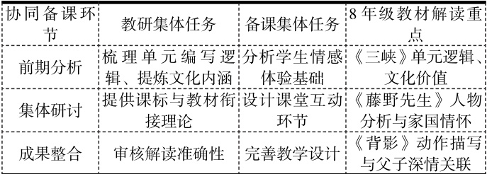 借助“分工—协作—整合”协同备课模式,双集体教研助力教师深入剖析八年级语文教材的内在核心,教研集体首先梳理由内教育出版社所编写的八年级教材的编写逻辑,比如在《三峡》中,有关“景物描写与情感表达关联”的设计意图进而形成《教材单元架构分析表》;备课集体则根据学生的学习情况,专注于单篇课文的重点和难点之处像在《藤野先生》中人物形象分析和家国情怀传承的结合点。二者借助“独立备课、集体研讨、模拟课堂、重构完善”这一流程,对教师个体解读所存在的局限性加以弥补和完善。举例来说,在准备《背影》这一课程时,教研集体给出“叙事视角与情感表达”方面的理论支持,备课集体规划“细节品读、情感梳理、生活联结”这样的教学步骤,共同明确教材里“动作描写与父子深情”之间的深层次联系,从而让解读更具系统性(见表1)。