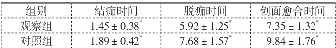 观察组的创面结痂时间、脱痂时间及完全愈合时间均显著短于对照组,差异有统计学意义( P<0.05 )。(表3)