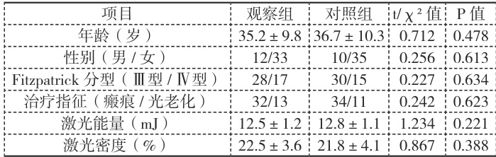 两组患者在年龄、性别、皮肤分型、治疗指征及激光治疗参数等方面比较,差异均无统计学意义(P>0.05),具有可比性。(表1)