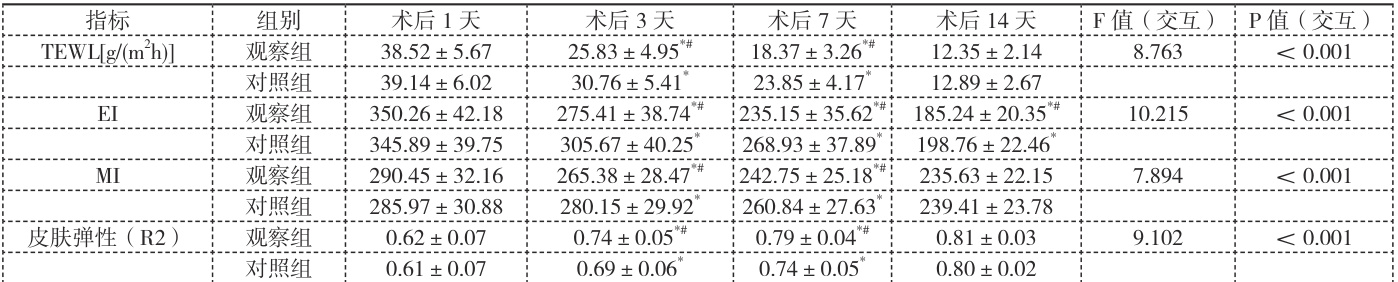 术后第 1 天,两组的 TEWL、EI、MI 值均较基线显著升高,皮肤弹性下降,且组间无显著差异( P>0.05 ),表明激光等造成了同等程度的皮肤屏障损伤。术后第 3 天和第 7 天,两组的各项指标均开始恢复,但观察组的TEWL、EI、MI 值均显著低于对照组,而皮肤弹性(R2 值)显著高于对照组,差异均有统计学意义( P<0.05 )。至术后第 14 天,两组各项指标均基本恢复至接近术前水平,但观察组的 EI 值仍略低于对照组( P<0.05 )。(表2)