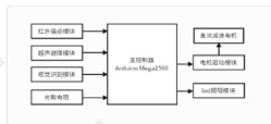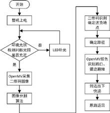 系统的主控制工作流程为:光照调节模块识别光照强度→ 0penMV 识别二维码并发送目标位置信息 $$ Arduino 根据目标位置规划路径→红外传感器进行路径跟踪→超声波传感器实时检测避障→到达目标位置完成配送→完成后原路返回。