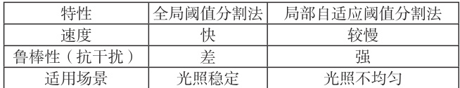表1 全局阈值分割法和局部自适应阈值分割法特性对比