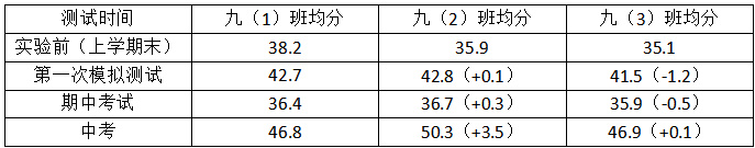 随着实践深入,实验班成绩提升幅度明显高于对照班。至期中考试,九(2)班平均分反超对照班 3.5 分,九(3)班也与对照班成绩持平并略有超出。