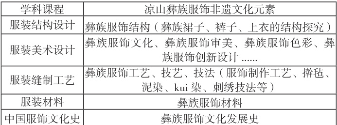 根据各学科的特点,挖掘学科内可渗透的凉山彝族服饰非遗文化元素,挖掘凉山彝族服饰非遗文化中的学科育人价值,在学科主干课程的教学内容中渗透或嫁接相关内容,并进行专题拓展性的课堂教学,探索“专业课程 + 非遗课程”融合教学模式模式下的校本教材及校本课程资源开发。