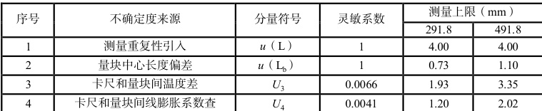 输入量 Lb 的不确定度主要来源于量块中心长度尺寸的不确定度,可根据 JJG146-2011 量块检定规程,采用 B 类方法进行评定。测量用的 5 等量块其中心长度尺寸的测量不确定度不大于:( 0.50+5×10-6L ) μm (L——测量长度,单位: μm ),包含因子取 2.7 所以当 L=291.8mm 时标准不确定度 u (Lb) )为