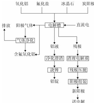 其电解过程为,在电解槽中加入氧化铝、氟化盐、冰晶石等生产原料,之后向电解槽通入强大的直流电,经过电解质与铝液层,然后从阴极导出。在阴极上得到液态铝,随着电解过程的不断进行,电解槽内的铝液量也不断地增加,当铝液达到一定高度后,就周期性的从电解槽中通过真空抬包将铝液吸出,最后运往铸造车间,经过配料、净化、过滤,浇铸成商品铝锭。电解后的残极则运往碳素厂重新进行处理,生产出新的阳极。生产过程中产生的废气经过净化后通过烟囱排出。
