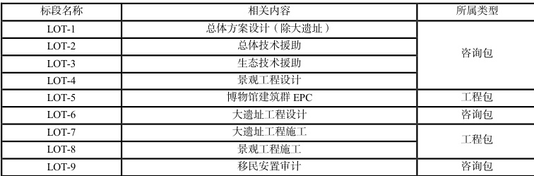 项目总投资由工程费用、工程建设其他费用、预备费、建设期利息构成。其中法国开发署贷款资金6000 万欧元,占总投资的 78.11% ,用于凤翔区遗址保护和提升、沿河生态系统修复和公共空间发展,以及部分工程建设其他费用、部分预备费用;建设单位自筹资金占总投资的 21.89% ,用于部分项目工程建设其他费用、部分预备费用及法国开发署贷款利息支付。按照项目调整后最新的采购计划,贷款资金将用于 9 个包的招标实施。包括6 个咨询包,3 个工程包(如表1)。