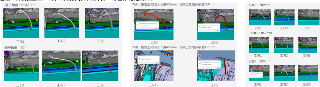通过软件模拟 3 种不同长度镀锡铜绞线在车侧正常和极限工况的安装状态,见图2。长度 850mm 时,工况3 的镀锡铜绞线被挤压严重;长度 550mm 时,工况 1 的镀锡铜绞线被拉扯严重。在车侧频繁的相对运动下,这两种长度均有断股的风险。