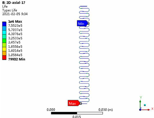 波纹管正常工况需反复压缩2 万次。疲劳强度因子取0.8,采用Gerber 理论计算的波纹管疲劳寿命,如图5所示。
