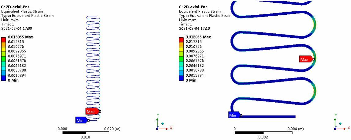 可知,极限工况与正常工况的波纹管Mises 应力水平相当,最大应力位于波纹管水平段中部,约220MPa,该处存在较大的多轴应力,材料已经发生屈服但是未达到抗拉强度,不会发生强度失效。经过分析波纹管中塑性应变最大的位置在外凸波峰处,最大塑性应变约 1.4%。