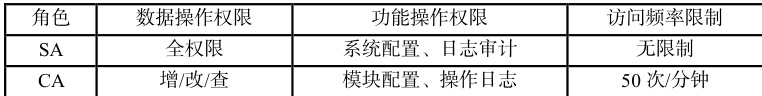 授权管理采用基于角色的访问控制(RBAC)模型,实现细粒度权限管理。RBAC模型定义三元组(R,P,S),其中 R 为角色集合,P 为权限集合,S 为角色[3]。角色层次结构分为 4 级:超级管理员(SA)、系统管理员(CA)、普通用户(GU)、访客(GV),权限继承关系满足 SA⊃CA⊃GU⊃GV 。典型权限分配见表 1: