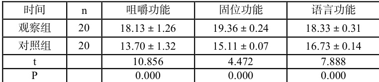 观察组咀嚼功能、固位功能、语言功能评分均高于对照组( P<0.05 ),见表 1。