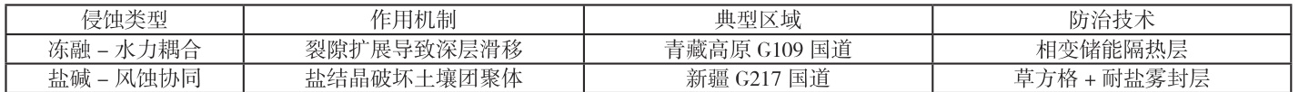 (2)盐碱- 风蚀协同作用:新疆G217 国道穿越盐渍化区域,土壤含盐量 >1.5% 的路段,风蚀速率较非盐渍区提高 2.3 倍,盐结晶作用进一步破坏土壤团聚体结构。