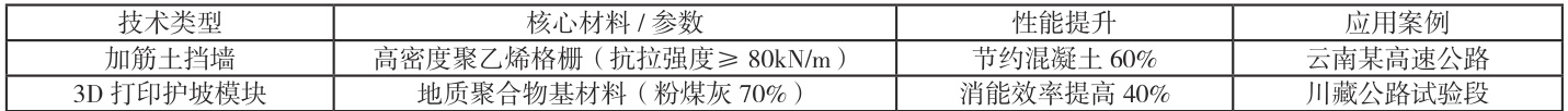 传统重力式挡土墙正逐步向生态 - 力学协同设计转型。3D 打 印护坡模块采用六边形多孔结构,适配川藏公路等陡峭岩质边坡(坡 度 30° -50°),其透水性(1.2×10 ⁻ ² cm/s)与生态混凝土结合, 既保障边坡稳定(安全系数> 1.35),又为植被扎根提供生境;应 用后次降雨产沙量从 12.5±1.3 t/hm² 降至 5.7±0.8 t/hm²,减沙效 益达 54.4%,显著高于传统生态袋护坡(32.7%,p<0.05)。加筋土 挡墙通过高密度聚乙烯格栅(抗拉强度≥ 80 kN/m)与改良填土的 分层压实,界面摩擦角 δ=32°,使 15m 墙高稳定系数 Fs>1.35, 并节约混凝土用量 60%。格宾挡墙创新采用玄武岩纤维网箱(网孔 尺寸 10×12 cm,透水系数 1.2×10 ⁻ ² cm/s),填充火山渣与种 植基质,配合深根植物使边坡稳定系数提升至 1.35。