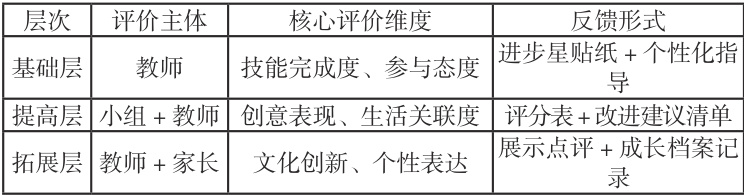 在“生活美学创作”单元评价中,笔者设计了分层评价方案(见表 1),基础层采用“教师一对一”的方式,着重考察拓印、拼贴等基本技术的完成情况,提高层实施“小组互评 + 教师点评”,运用包括“生活要素融入度”“构图合理性”维度的评分体系,并提出针对性的改进意见;延伸层举办“作品展示”,邀请家长参与评鉴。在课后笔者对评价资料进行汇总,针对基础层学生在色彩运用上存在的不足,创新性的增加了“生活色彩观察日记”微任务,以评价反哺教学。