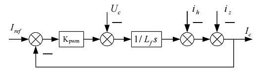 由于逆变器需输出稳定电压,且具备补偿不平衡电流的能力,因此采用电流电压双闭环控制策略。在该策略下,电流内环控制电容电流作为反馈信号,为提高系统的响应速度和具有更大增益,电流内环采取比例(P)控制器。电流内环控制器如图: