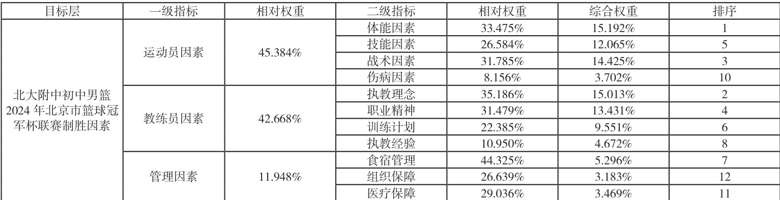 1.5 AHP 层次分析法 将北大附中初中男篮2024 年市篮球冠军杯联赛制胜因素层次框架表中的各个因素通过专家评判两两比较,计算各因素权重排序。[1]