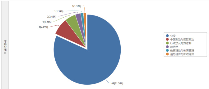 从研究学科分布计量可视化分析来看,如图 3 所示,“警务社会化”在公安学研究领域占比最高,达到 81.58% ,这一压倒性占比充分表明,警务社会化被视为公安学研究范畴内的一个核心与前沿议题。它主要被理解为一种现代的警务战略、警务改革模式或公共安全供给方式,其理论研究直接服务于公安实战工作的创新与变革,具有鲜明的问题导向和行业属性。然而,在高度聚集的格局之外,也初步显现出跨学科研究的趋势。除公安学外,研究成果还零星分布于法学(尤其是行政法学、警察法学)、公共管理学(从公共产品、社会治理角度切入)、社会学(关注社会资本、社区参与)以及经济学(涉及成本效益、服务外包)等学科领域。这表明,警务社会化作为一个复杂的社会现象,其内涵的丰富性正在吸引不同学科学者的关注。它不仅仅是一个警务实务问题,更是一个关乎国家治理、法治建设、政府职能转型与社会协同的综合性命题。