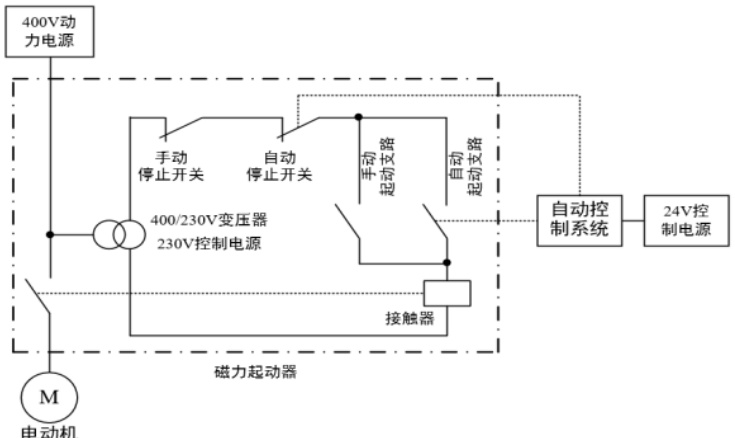 以新能源船舶系统为例,磁力起动器的 400VAC 主电路使用三相交流接触器进行通断控制,主电路的热保护使用三相交流热继电器进行监测。磁力起动器设置有手动控制、自动控制切换功能,以保证特殊情况或紧急情况下可进行手动控制。