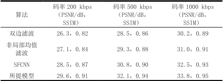 由表1 可知,各码率场景下所提模型指标均最优。200 kbps 低带宽极限场景,PSNR 较双边滤波提升 3.3 dB、较 SFCNN 提升 1.1 dB;SSIM 较双边滤波提升 0.09、较 SFCNN 提升 0.04,印证模型对压缩伪影与传输噪声的消除能力,这源于帧间时空特征利用与通道注意力机制对关键失真的抑制作用。