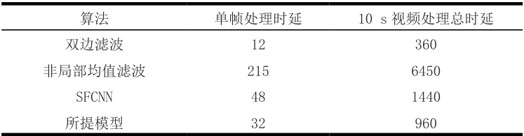 由表2可知,所提模型单帧时延 32ms,10 s总时延 960ms ,虽高于双边滤波,但远低于非局部均值滤波与 SFCNN。实时性优势源于轻量化设计:FEN 采用轻量 U型结构减少运动估计计算量;多尺度 CNN 通过并行分支与小尺寸卷积核组合,在保证特征提取能力的同时将参数降至8.2 M(较SFCNN减少 35% ),满足实时通信(单帧时延 ⟨100ms| )要求。主观效果上,所提模型增强帧块边界无灰度跳变、边缘清晰、噪声抑制彻底,对比算法低码率下仍有明显伪影。