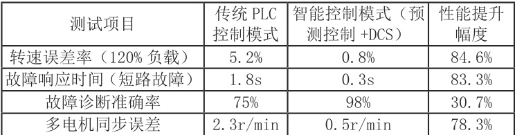 实验结果如表 1 所示,在转速控制精度测试中,传统 PLC 控制模式的转速误差率随负载增加显著上升,当负载为 120% 额定负载时,误差率达到 5.2% ;而基于人工智能的预测控制模式在各负载条件下,转速误差率均稳定在 0.8% 以内,控制精度较传统模式提升 84.6%。在故障响应性能测试中,传统 PLC 控制模式平均响应时间为 1.8s,故障诊断准确率为 75% ;智能控制模式平均响应时间缩短至0.3s,故障诊断准确率提升至 98% 。实验数据表明,智能控制模式通过实时数据分析与预测算法,有效解决了传统控制模式在动态工况下精度不足与故障响应滞后的问题。同时,分布式控制系统在多电机协同控制测试中,实现了各电机转速同步误差控制在 0.5r/min 以内,较传统集中式控制模式的同步误差(2.3r/min)降低 78.3% ,验证了分布式协同控制机制在多设备联动场景中的优势。