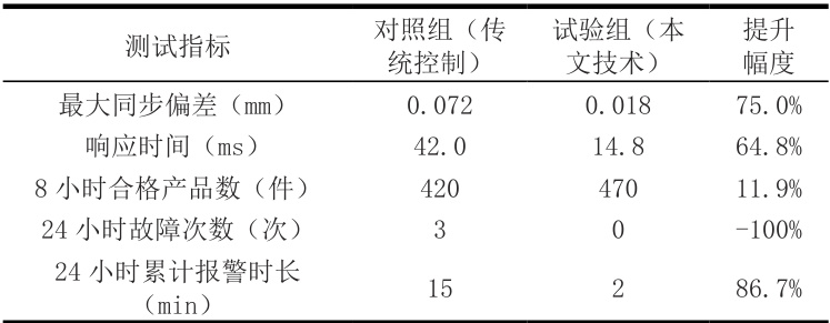 测试结果如表 1 所示。对照组采用传统控制方案时,多轴最大同步偏差为 0.072mm,超出生产要求的 ±0.03mm ;响应时间平均为 42ms,无法满足高速协同需求;8小时内合格产品数量为420件,生产效率较低;24 小时内出现 3 次通信故障,累计报警时长 15 分钟。试验组采用本文技术方案后,最大同步偏差降至 0.018mm,满足精度要求;响应时间缩短至 14.8ms,较对照组降低 64.8%;合格产品数量提升至 470 件,生产效率提高 11.9% ;24 小时内无通信故障,仅出现 1 次伺服过载报警,报警时长 2 分钟。测试还表明,当生产线负载波动达额定负载的 20% 时,试验组同步偏差仅增加 0.005mm ,而对照组增加 0.021mm ,验证了所提技术的抗干扰能力。