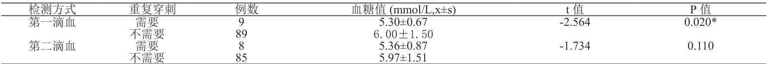 需要重复穿刺组8 例(第一滴血)或9 例(第二滴血),不需要重复穿刺组85 例或89 例。第一滴血检测中需要重复穿刺组血糖值显著低 第二滴血检测两组差异无统计学意义( P=0.110>0.05 )[7],见表3。于不需要组( 5.30±0.67 vs 6.00±1.50 mmol/L, P=0.020>0.05) ),