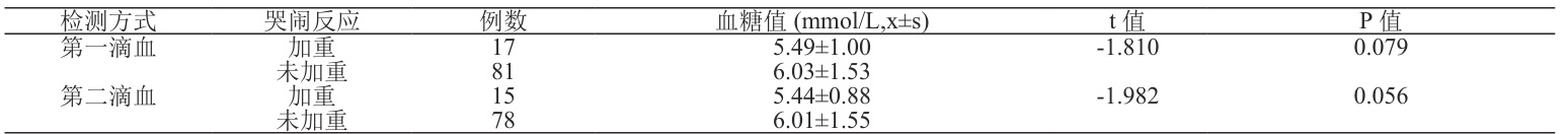 哭闹加重组 17 例(第一滴血)和 15 例(第二滴血),两组间血糖检测结果差异均无统计学意义( (Pgtrsim0.05 ),见表4。