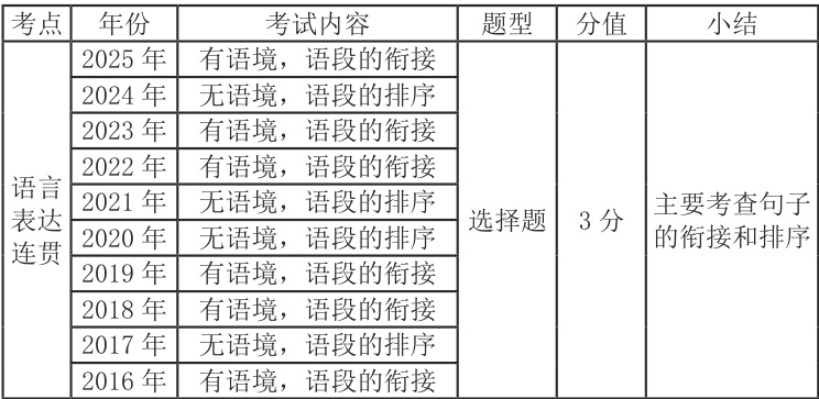 1. 此考点是必考题,要求学生“掌握常见语言表达技能”,命题形式表现为句子的衔接和排序。历年都是以选择题的形式出现在第8 题,但 2024 年与病句辨析位置互换,出现在试题第 6 题。此题考生可通过专项真题练习,摸索答题技巧。