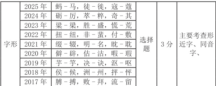 1. 字形考查属于必考题,要求学生“识记现代汉字常用字的字形”,考查内容一般是《现代汉语常用字表》中的2500 个常用字和1000 个次常用字。字形是高考必考内容,近十年都以选择题的形式出现在第2 题。