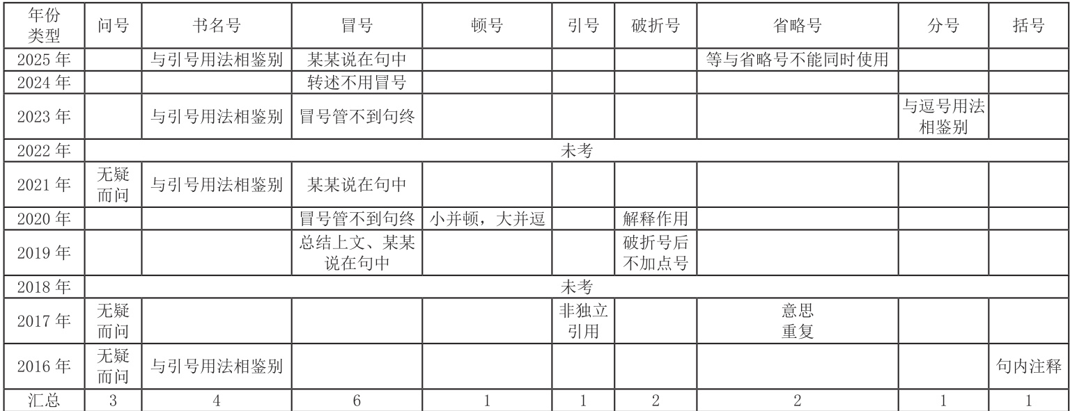 1. 此考点属于常考题,要求学生正确使用标点符号:句号、问号、叹号、逗号、顿号、分号、冒号、引号、括号、书名号、破折号、省略号、连接号、间隔号和着重号。除2018 年和2022 年未考之外,近十年的其余年份都以选择题的形式出现在第3 题,分值3 分。