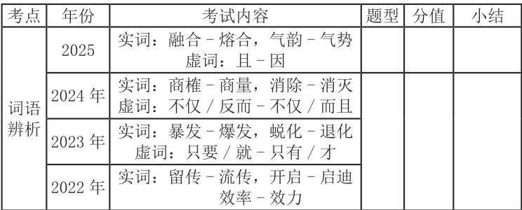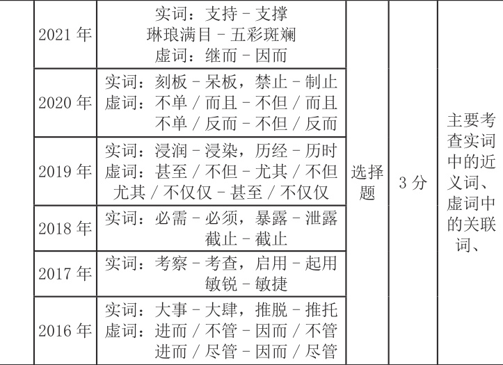 1. 词语辨析属于必考题,要求学生“正确使用词语(含熟语)”,考验学生结合语境准确选择词语的能力,通常将实词和虚词结合起来考查。