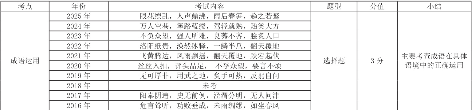 1. 成语运用属于必考题,主要考查常用、易错的成语(熟语),学生应加强对常用成语意义的理解和积累。除 2018 年未考,除余年份都以选择题的形式出现在第5 题。