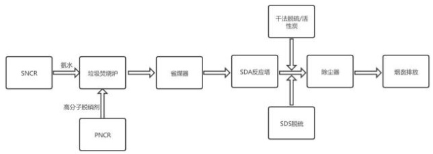 焚烧炉烟气经过余热锅炉,再经省煤器进入 SDA(半干法)反应塔脱除烟气中的硫化物,然后烟气再经干法脱硫 + 活性炭 +SDS (干法)脱硫工艺,最后经过除尘器脱除灰尘颗粒物,经烟囱排放。具体流程见图1 :