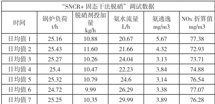 某垃圾发电厂配置 2×300t/d 焚烧炉 +1*15MW 汽轮发电机组,炉型为往复式机械炉排炉,余热锅炉为立式锅炉,额定蒸发量 25t/h ;过热蒸汽出口压力6.4MPa ;过热蒸汽出口温度 450∘C 。根据该垃圾发电厂“ 5NCR+ 固态干法脱硝”改造目标,锅炉负荷适应范围 75~100% ,NOx 排放浓度 ⩽80mg/m3 ,氨逃逸⩽8mg/m3 进行调试,经调试发现固态干法脱硝系统运行后 NOX 及氨逃逸量均可得到有效控制。调试数据见表1 :
