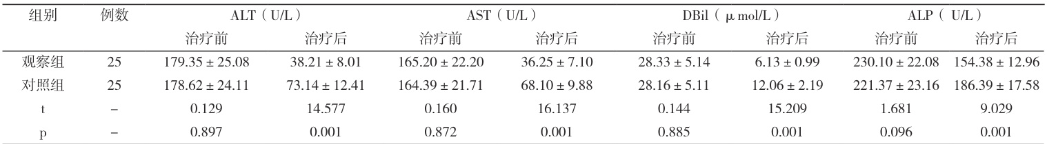 2.1 两组患者治疗前后肝功能情况对比