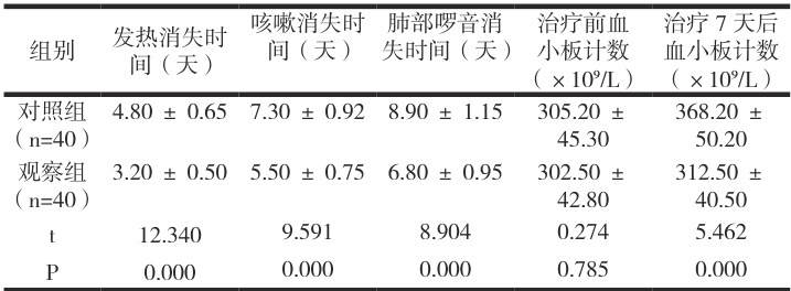 观察组发热、咳嗽、肺部啰音消失时间都比对照组短,治疗 7 天后观察组血小板计数比对照组低( P<0.05 ) 。