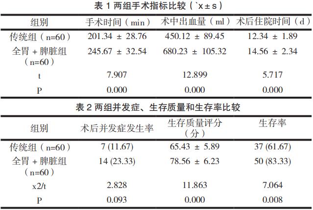 全胃 + 脾脏组手术时间和术中出血量多于传统组,术后住院时间长于传统组( P<0.05 );全胃 + 脾脏组术后并发症发生率高于传统组但差异不显著(P>0.05 );术后 1 年,全胃 + 脾脏组生存质量评分和生存率均高于传统组(P<0.05 )。
