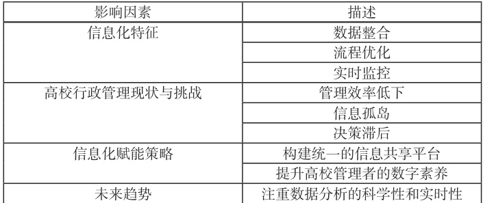 从信息化的概念及特征来看,信息化的核心在于通过信息技术的应用,提升信息的获取、处理、存储和传播的效率。具体来讲,信息化的特征主要体现在数据处理的自动化、工作流程的标准化以及资源共享的便利化等方面。这种转型为高校行政管理提供了以信息为导向的新思路,尤其是在面对复杂的管理环境与多样的需求时,信息化能够高效地集成不同部门的信息资源,形成一个全面的数据支持体系,以促进更加科学的决策过程。