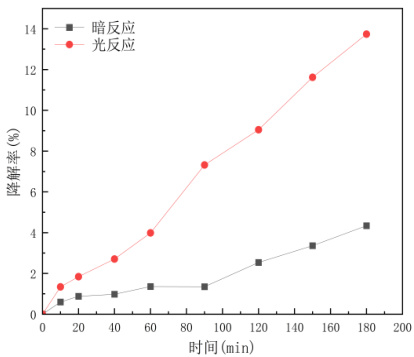 随着反应的进行,光暗反应条件下亚甲基蓝的降解率均逐渐增加,且光反应的降解率增加的更快(图 1)。此外,暗反应和光反应 3h 后,亚甲基蓝的降解率分别为 4.35% 和 13.75%⨀ 。以上结果表明,水锰矿有一定的光催化性能。根据氧化锰矿物光化学反应机理,当照射光能量大于禁带宽度时,占据价带的电子(主要是锰氧化物中的 O-2p 态)被激发到未被电子占据的导带(主要是锰氧化物中的 Mn-3d 态)[4]。水锰矿在光源的照射作用下,价带的电子激发进入Mn-3d 轨道形成电子 - 空穴对,电子和空穴进一步与水和溶解氧氧反应,生成具有强氧化性的自由基( 如·OH),亚甲基蓝通过与一系列的自由基反应实现降解 [5]。
