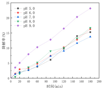 不同 pH 条件下亚甲基蓝的降解率如图 2 所示。pH 为 5.0\~9.0 时,亚甲基蓝的降解率随反应时间的增加均不断提高。pH 为5.0\~8.0 时, pH 升高对亚甲基蓝的降解略有促进,但影响不显著; pH 为 9.0 时,表现出较高的降解效率,最高可达 23.14% 。本研究中,pH 为 9.0 的碱性条件下,更有利于水锰矿被光催化形成更多的电子- 空穴对,产生较多的自由基,得出更好的降解效果 [3]。