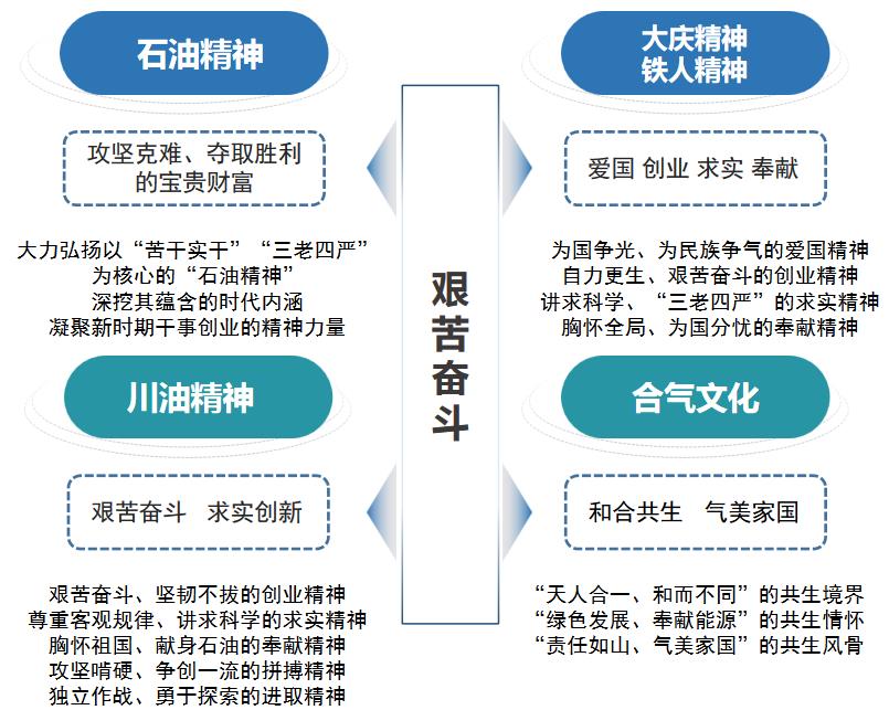 艰苦奋斗精神是西南油气田不断发展壮大的力量源泉和精神支柱。从为了国家需要到填补国内空白,再到新中国第一个区域性天然气工 业体系的形成;从区域性天然气勘探到全国性天然气技术支撑,再到跨入千万吨级大油气田行列;从勘探开发一体化到地质工程一体化,再到 成为我国陆上第四大油气田,贡献巴蜀智慧和西南担当,西南油气田重现川中石油会战、红村石油会战的豪迈气势,接续“32111 英雄钻井队” 的勇毅胆识,并在开油找气的伟大实践中孕育出“艰苦奋斗、求实创新”的川油精神,成为大庆精神、铁人精神在西南地区的生动体现,并 在扎根四川盆地的发展历程中深耕细酝,升华凝练出以“和合共生、气美家国”为内核的合气文化,以文化精神凝聚发展共识,汇聚发展合力。 艰苦奋斗精神始终贯穿于西南油气田的峥嵘创业史,成为引领公司精神文明和物质文明建设的文化之根、队伍之魂、安身之本。