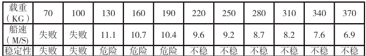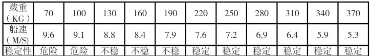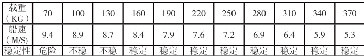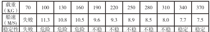 为避免测算结果单一,同时采用 4.2 米信光皮划艇进行实地测算得出的测量数据为:首先,以 4.2 米信光皮划艇,40 匹马力船外机为器材开展测试。现在水流流速为 0M/S,通过在同一起点同一终点油门不变的情况下,船速与船上载重的关系。