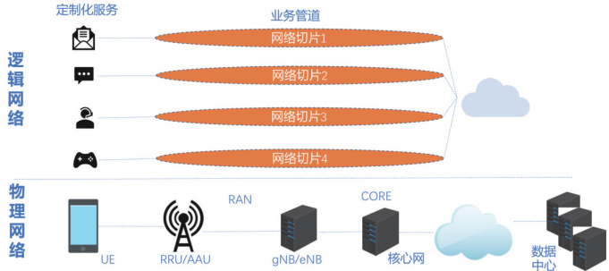 在 5G 低空智联场景中,不同类型飞行器所承载的业务存在差异,飞控指令、高清视频回传、任务协同通信等在时延、带宽方面的需求差异巨大,为实现多业务并发保障,需应用网络切片技术。网络切片是在一张物理网络基础上,利用虚拟化技术划分出多个逻辑网络,每个切片具备独立的网络资源,能够按照业务需求进行定制化配置,下图 2 展示了网络切片的典型架构,物理网络包括用户设备、远端射频单元、接入网、核心网和数据中心,逻辑网络层通过切片控制机制为不同业务提供专属通道,飞控业务可分配低时延高可靠切片,视频业务使用大带宽切片,普通信令可通过基础切片承载。该模式下,低空飞行器在接入 5G 网络时无需争抢通用资源,可以按需分配专属服务路径,提升通信效率,同时网络切片还支持动态编排与按需扩展,便于应对任务突发下的资源灵活调度,实现5G 网络智能化[2]。