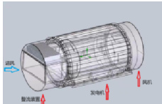 整流装置后端安装在电机前端盖处,进风口在整流装置前面(非电机接触面),散热风机布置在电机的后端,因此一体化整流装置的结构设计除了要满足自身的温升要求外,还必须保证通风量,确保电机的温升不超过设计值。考虑使用环境和工业化设计,确定发电机直径设计外观为圆柱形,上部利用网板通风,下部为操作口;为满足野外工况,防护等级做到 IP65,底部压密封条和封防水密封胶做防水处理。