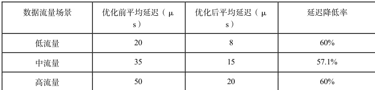 将传输机制优化前后在同样的仿真场景下实施对比测试,由结果可知,优化后的传输机制在平均延迟(表 1)、最大延迟方面均实现显著降低,面对高数据流量这种场景时,优化开启前,平均延迟达50 微秒,延迟减至 20 微秒,最大延迟从 100 微秒优化到了 40 微秒。