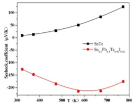 1.Pb、I 掺杂的作用:引入 Pb 元素并经 PbI₂掺杂,成功实现 SnTe 从 p 型到 Πn 型的转变(如图 4 所示,当Pb 掺杂量为0.4、I 掺杂量为0.02 时,样品Seebeck 系数为负,表现n 型导电)。Pb 元素弥补本征Sn 空位,降低空穴浓度,PbI₂实现Te 位电子掺杂,改变载流子类型,为n 型材料制备关键。