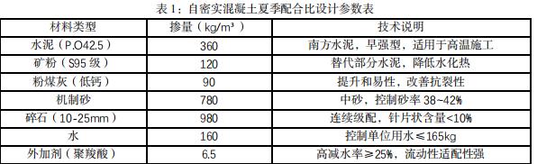 项目配合比设计以 P.O42.5 水泥为主体胶凝材料,辅以 S95 级矿粉与低钙粉煤灰协同构建低水化热、高工作性浆体体系,机制砂粒型控制在中砂级别,连续级配碎石最大粒径 25 毫米来保证泵送顺畅[4]。水胶比控制在 0.33\~0.34,砂率约为 39% ,单位用水量不超过 15kg。聚羧酸系高性能减水剂掺量约为胶凝材料质量的 1.2%~1.5% ,减水率不低于 25%o 此参数设计结合现场实际情况多轮调整,最终确定如下配合比见表 1